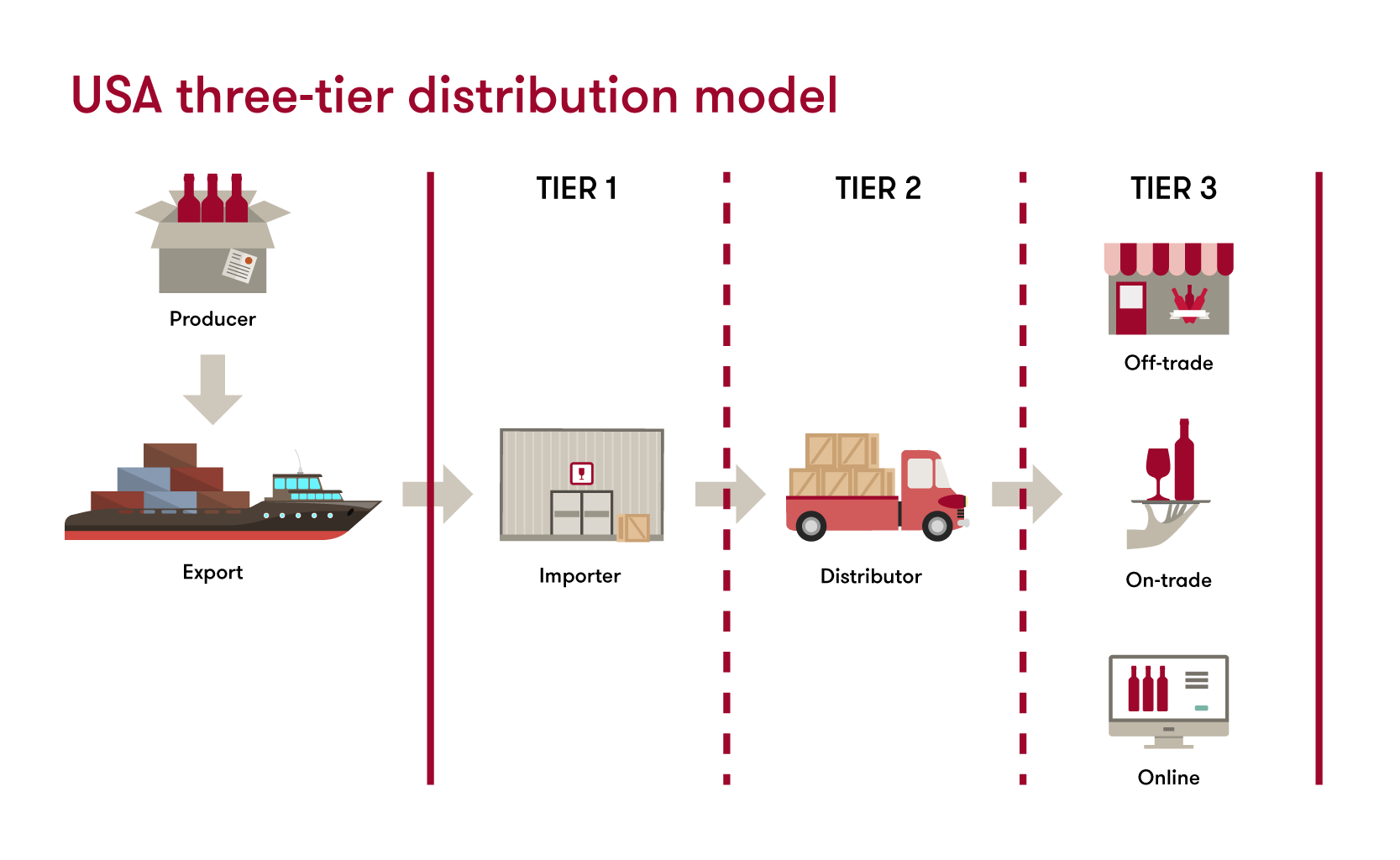 Because every market is different, it is impossible to walk you through the potential avenues for exporting your wine in every country. For the sake of demonstration, we will examine some of the different business models that Australian exporters are using to get their wine into the United States of America (USA). While the three-tier system is the most common, it is not the only way to export wine.